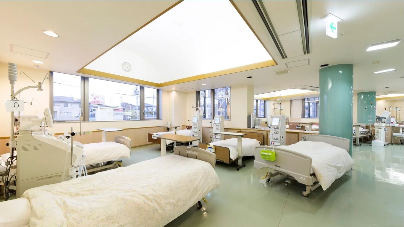 患者さまに少しでも寛いでいただけるように、ゆったりとした空間作りを心がけています。透析においては透析時間をリラックスしてお過ごしていただけるようベッド間隔を広めにレイアウトしております。